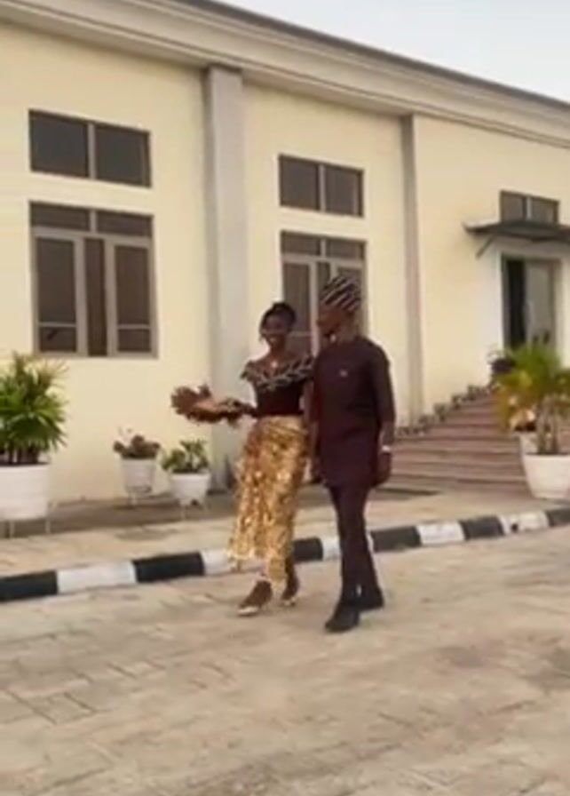 A young couple, dressed in formal Nigerian attire, walks hand-in-hand on a paved area in front of a two-story, light-colored building
