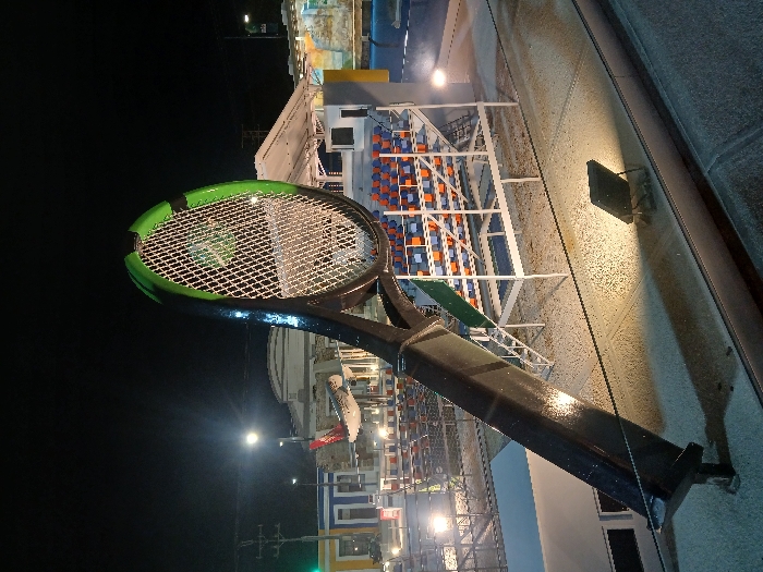 - "A large, black tennis racket statue stands on the side of a wall at night" by FM-YF5w12, licensed under CC BY 4.0