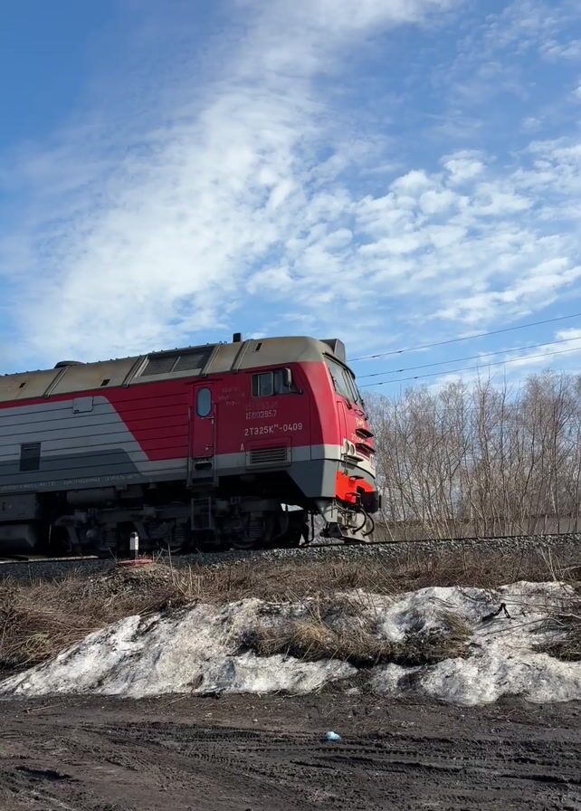 red and grey Russian Railways (RZD) train passing from left to right on a track under a blue sky with scattered white clouds