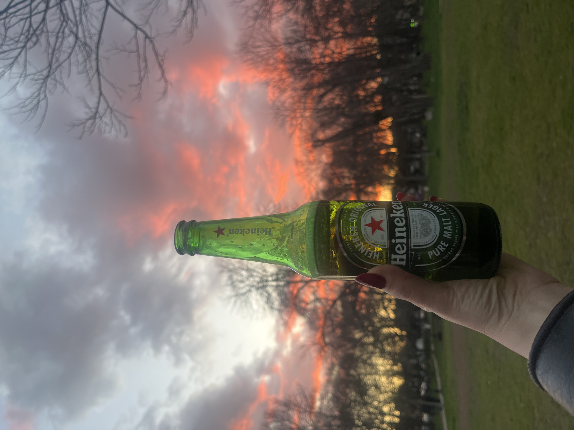 A horizontal, medium shot captures a hand holding a green Heineken beer bottle against a dynamic sky. The hand, adorned with dark red nail polish, firmly grasps the bottle. The sky behind is a mixture of gray and orange, with some branches of trees slightly visible. The scene includes elements of a park or outdoor setting, hinted at by the green grass and blurry trees. The beer bottle is the primary focus, showcasing its green color and recognizable branding. The interaction is of a person holding a beer, and the environment appears to be in the city of Sofia, Bulgaria.