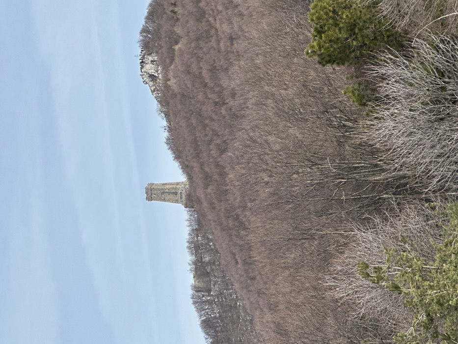 The image displays a mountainous landscape featuring the Shipka Monument near the city of Shipka, Bulgaria, under a clear, light blue sky. The Shipka Monument, a gray stone tower structure, occupies a prominent position on a tree-covered hillside in the upper-mid portion of the frame. To the monument's right, and situated at a higher elevation, a rocky peak is visible. This peak hosts approximately 15-20 individuals clustered at its summit, alongside a visible cross. A smaller, weathered stone structure is partially discernible among bare trees on a lower slope to the left of the main monument. The foreground and midground are dominated by dense forestation consisting primarily of leafless deciduous trees, interspersed with some evergreen pine trees. Patches of snow are visible on the ground beneath the trees on the left side of the image, indicating cold weather conditions.