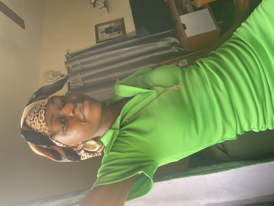 A woman in a ribbed, lime green dress with a zipper neckline and a gold necklace poses for the camera. She wears a patterned headscarf. In the background are gray curtains, a framed picture on the wall, and a light-colored cabinet. The image has a slightly tilted, soft focus effect.