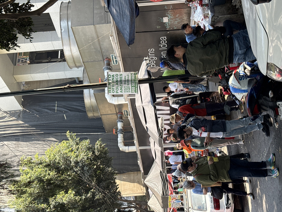 A street scene features a crowd of people lining up along a sidewalk. A building with large cylindrical structures is visible on the left. A sign advertises office space for rent in Polanco and Anzures, with a phone number and website listed. Cars and motorcycles are parked on the right, adding to the congestion. The lighting suggests it's daytime.