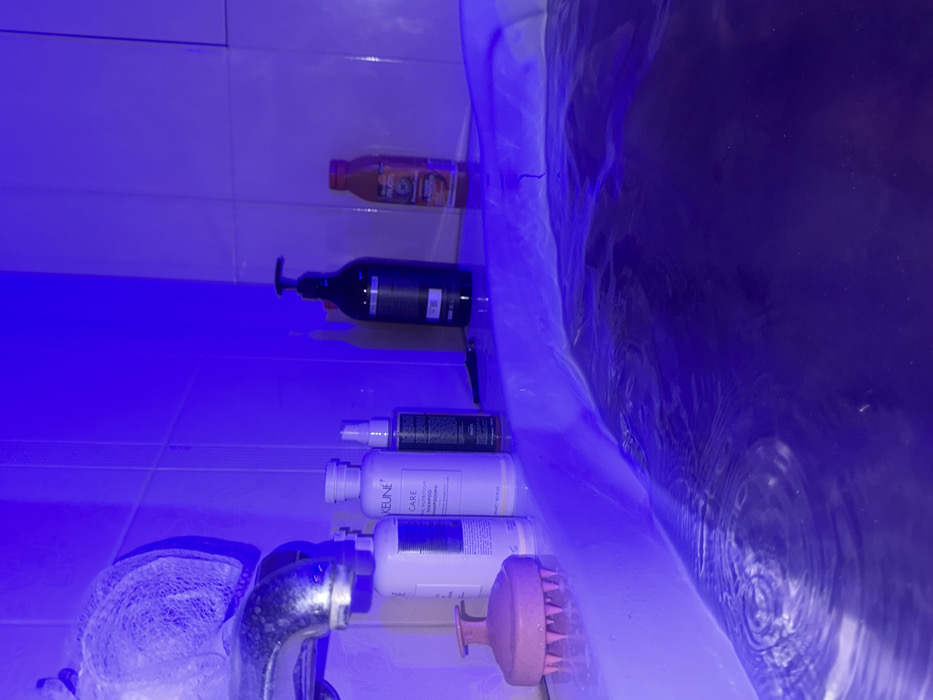 The image depicts an interior bathroom scene, dominated by strong blue ambient lighting, making the specific location in Khimki, Russia, undeterminable from visual evidence. The primary subject is a white bathtub, approximately one-third filled with water that appears dark blue or purple due to the illumination. Ripples are visible across the water's surface. On the rim of the bathtub, from left to right, are a pink silicone scalp massager with soft bristles, two white bottles (one with a pump top, labeled "KEUNE CARE VITAL NUTRITION SHAMPOO"), a clear or dark spray bottle, and a dark pump bottle. Further to the right, an orange bottle with a dark cap, possibly a beverage or bath product, is also present. A metallic faucet with a white, mesh-like shower puff or loofah hanging from it extends from the tiled wall above the bathtub on the left side of the frame. The background consists of white tiled walls, uniformly bathed in the blue light. No individuals or active interactions are visible in the scene.