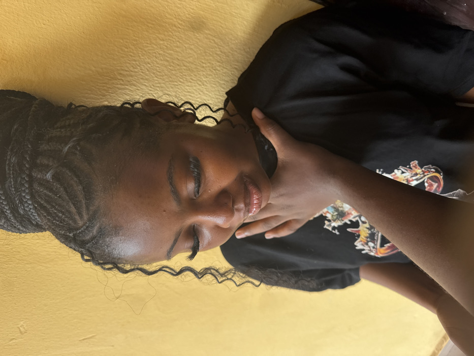 The scene is set indoors against a textured, plain yellow wall in Ipetumodu, Nigeria. A young Black female is depicted from the chest up, with her head tilted slightly downward and eyes closed or cast low. Her hair is styled in long, dark braids gathered into a high bun, with thin, curly braided strands framing her face. She wears prominent false eyelashes and a black t-shirt featuring a multi-colored graphic design on the chest. The hand and lower forearm of a second individual, also with dark skin, are visible. This hand is placed across the primary subject's upper chest and lower neck.