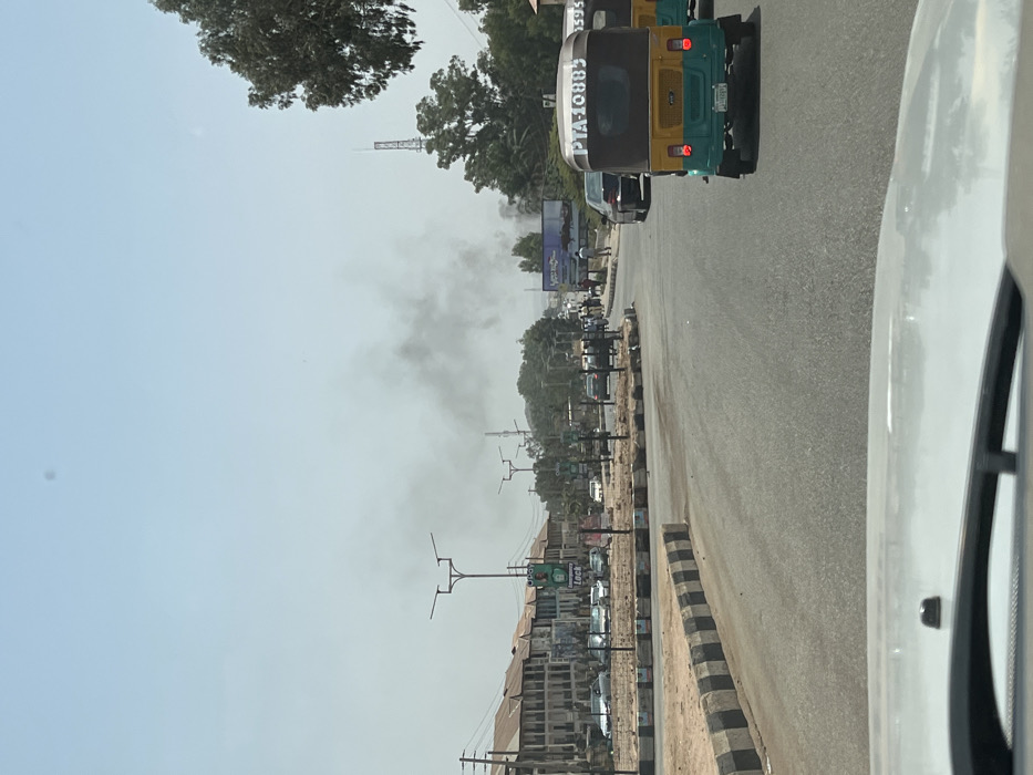 The image depicts an outdoor daytime scene in Gura Top, Nigeria, viewed from the interior of a vehicle
