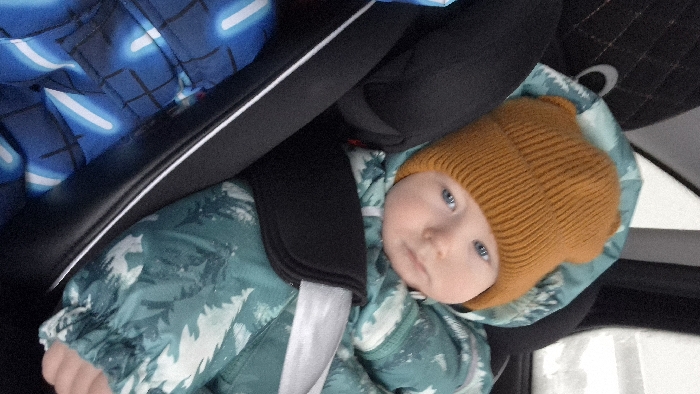 A young infant is depicted in a close-up, three-quarter view, seated and secured within a black child safety car seat inside a vehicle in Kamennyi Kliuch, Russia