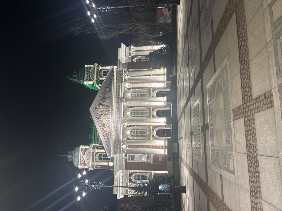The image depicts the Ivan Vazov National Theatre in Sofia, Bulgaria, at night