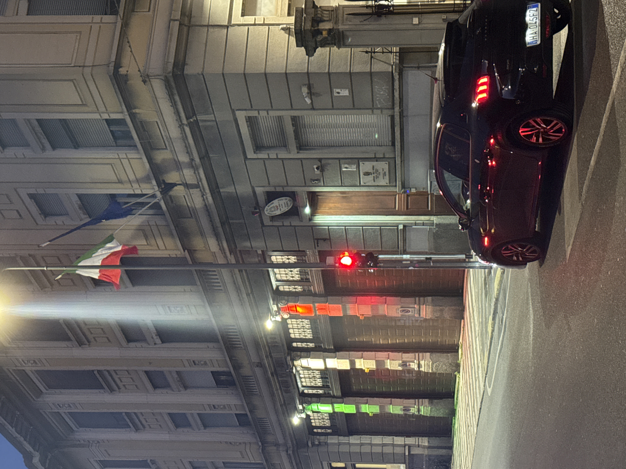 A night scene in Milan, Italy, reveals a multi-story building with classical architectural details, including ornate window frames and cornices. A flagpole bearing the Italian flag extends from the building. Streetlights illuminate the area, casting a glow on the street. Reflected colors, including green, amber, and red, are cast on the façade. A black car is parked on the street, partially obstructing the view. The car's license plate, "HA 045FZ," is visible. The traffic signal shows red.