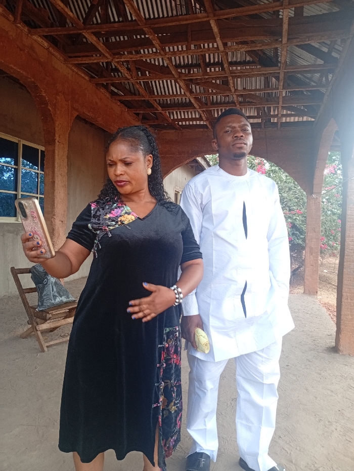 Two individuals are positioned outdoors in Ugwolawo, Nigeria, under an open-air structure featuring reddish-brown pillars, beams, and a corrugated metal roof. On the left, a female subject, appearing middle-aged, stands holding a gold-toned smartphone with a textured case in her raised right hand. She wears a black velvet midi-dress with short sleeves, a V-neckline, and a multi-colored floral pattern on the upper left chest and a matching velvet panel with frog closures along a slit on the lower right side. Her left hand rests on her abdomen. She has dark hair styled in braids, gold hoop earrings, and multiple white beaded bracelets on her left wrist. To her right, a male subject, appearing young adult, stands with his hands clasped in front of him, holding a rolled-up yellow object in his right hand. He is dressed in a white traditional two-piece outfit consisting of a long-sleeved tunic with black vertical detailing and matching trousers. He wears black slide sandals with a "TF" logo. In the background, to the left of the female, a light-colored building with a single window is visible. A folded wooden chair sits behind her. Further back, on the right, green foliage with intermittent pink blossoms is present. The ground is unpaved and light brown.