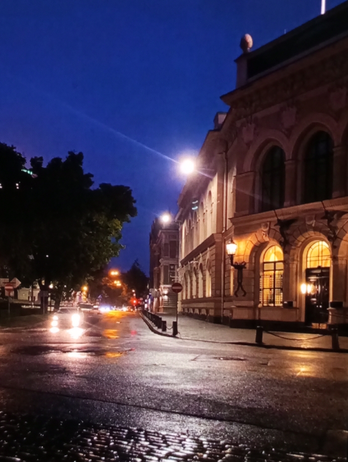 The image displays an urban street scene at night or during deep twilight, under a dark blue sky. The pavement is wet and highly reflective, suggesting recent rain. This scene is located in Stopiņu pagasts, Latvia. On the left side of the street, a line of mature trees with dark, dense foliage partially obstructs the background. Several white road signs are discernible among the trees. The right side of the street is bordered by a multi-story building exhibiting classical or Art Nouveau architectural elements, including ornate decorative moldings, pilasters, and multiple arched windows. The ground-floor windows emit a warm, orange-yellow light. A distinctive decorative street lamp, featuring a dark-colored, human-like figure holding a lantern, is affixed to the building's facade. On the sidewalk in front of this building, a red circular "No Entry" sign with a white horizontal bar is visible, along with several dark bollards connected by chains. The street surface in the immediate foreground consists of cobblestones, transitioning to a dark, wet asphalt or similar material further into the distance. Bright white headlights and red taillights from multiple vehicles are visible in the middle distance, appearing as luminous blurs due to motion or reflection on the wet surface, indicating active traffic. No individuals are clearly discernible within the frame.
