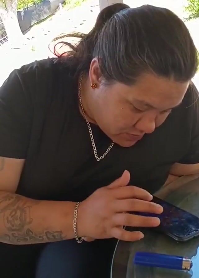 A woman with dark hair in a ponytail, wearing a black t-shirt, black pants, and jewelry, is sitting at a glass-topped table outside. She is looking down at her phone and touching the screen. There is a blue lighter on the table next to the phone. Her left arm has a visible tattoo. The background shows a grassy area and a white railing.