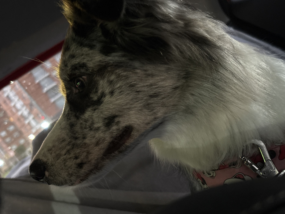 A merle-patterned dog, predominantly white, grey, and black with brown spotting, is depicted in a close-up, upward-angled shot. Its head is raised, and its gaze is directed slightly upwards and to the left, indicating observation of something outside the frame. The dog wears a pink collar featuring white cartoon-like designs, with a silver metal leash clip attached. The setting appears to be the interior of a vehicle, with a dark, indistinct interior visible to the left. Through a window, an out-of-focus urban landscape is visible at night or dusk, characterized by blurry red-orange brick buildings and multiple diffuse artificial light sources, including one prominent red light. No specific landmarks are present to pinpoint a precise location within Bogota, Colombia. No human subjects are visible.