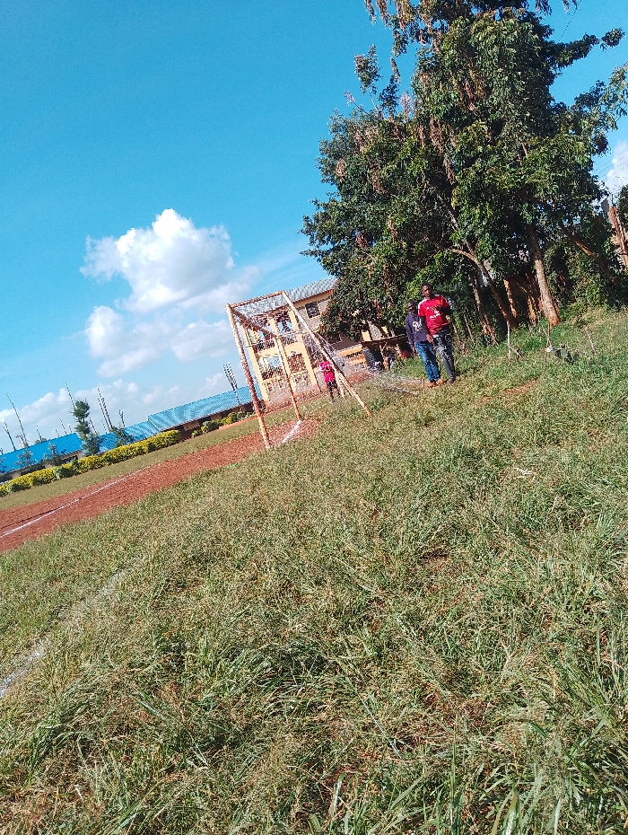 grassy field with a soccer goal in the background. There are two people standing near the goal. One is wearing a red shirt and the other is wearing a blue shirt. The grass is long and green, and there are some white lines drawn on the field. The sky is blue and there are some white clouds. There are some trees in the background. The image appears to be taken in Rungiri, Kenya, at coordinates -1.249 latitude and 36.692 longitude.