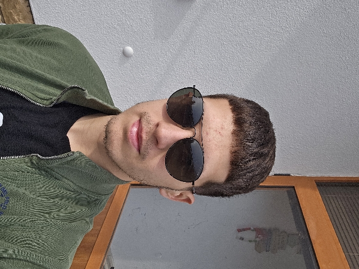 A young adult male is depicted in an upper-body outdoor portrait against a building exterior in the city of Levski, Bulgaria. The subject has short, dark brown, textured hair with a blunt fringe and light skin, exhibiting stubble on the chin and upper lip. He wears dark-tinted, black-framed aviator-style sunglasses, an olive green ribbed zippered jacket partially unzipped, and a black t-shirt with a partial white graphic. The background includes a light grey, textured wall on the left, featuring a small white spherical fixture. To the right, a brown wooden frame with reflective glass panels reveals an indistinct colorful reflection. A light-colored material forms a base along the bottom of the grey wall. The scene is lit by natural light.