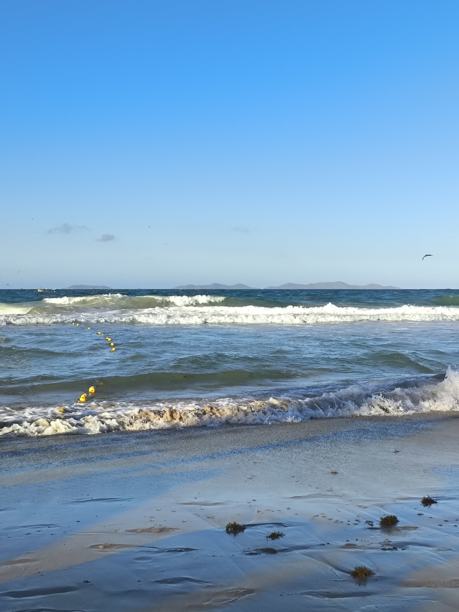The image depicts a beach scene at Playa Parguito, Venezuela. The sky is a clear blue. The ocean has waves breaking onto the shore. A string of yellow buoys extends into the water. The beach sand is wet and reflective, with some seaweed scattered across it. In the distance, there are land formations or islands visible across the water. There is a bird in flight over the water.