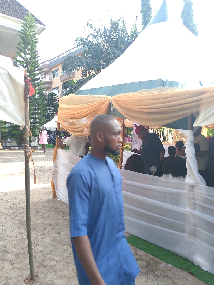 A man in a blue tunic stands in the foreground. Behind him, a white tent decorated with draped, gold fabric covers a gathering of people. A man in dark clothes and a red cap stands among them. In the background, a young girl in a pink dress walks away. A tall, green tree stands to the left. The area appears to be an outdoor venue with paved ground.