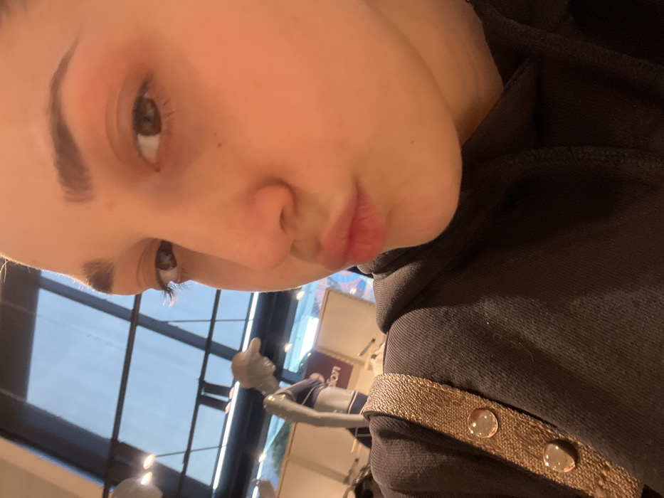 A person with light skin, dark eyebrows, and brown eyes looks into the camera with pursed lips. The background shows a window with a view of the sky and a mannequin giving a thumbs up. The person is wearing a black hooded sweatshirt with a brown and gold patterned strap across the chest, secured by two shiny, round fasteners.