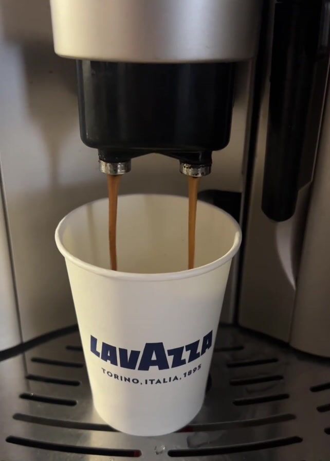 Lavazza coffee machine dispensing coffee into a white paper cup