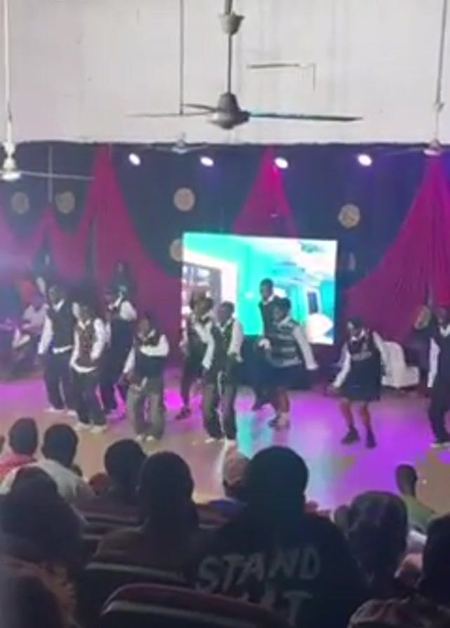 group of approximately 12 young people performing a coordinated dance routine on a stage. They are wearing dark clothing, some with vests or blazers, and are lit by colorful stage lights. Behind them is a large screen displaying images. The stage is decorated with pink and red drapery and circular decorations. The performance is being watched by an audience seated in rows of chairs. The audience includes people of different ages and ethnicities. A ceiling fan is visible above the stage.