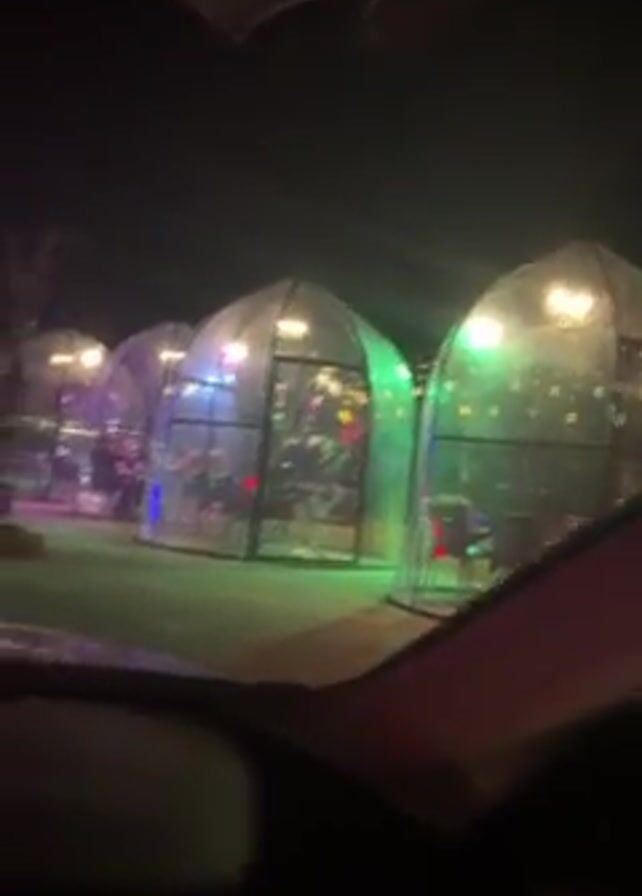 From the perspective of someone inside a car driving slowly at night, the video shows a brightly lit outdoor area with several transparent, dome-shaped structures with tables and chairs inside