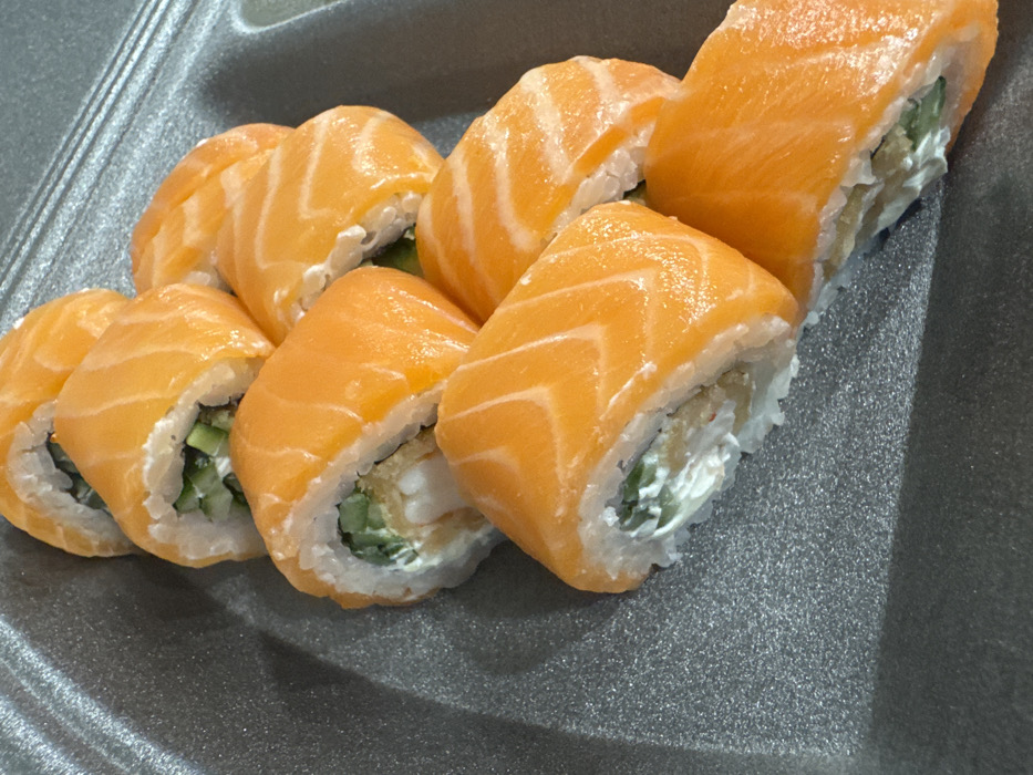 - "The image displays eight salmon sushi rolls uniformly arranged in a diagonal line within a dark gray, textured, disposable takeout container" by FM-fCTdw1, licensed under CC BY 4.0