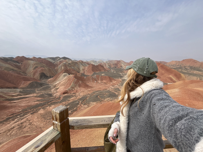 - "An individual is depicted from behind, standing on a wooden observation platform overlooking the Zhangye Danxia National Geopark in Zhangye, Gansu Province, China" by FM-VYYYD2, licensed under CC BY 4.0