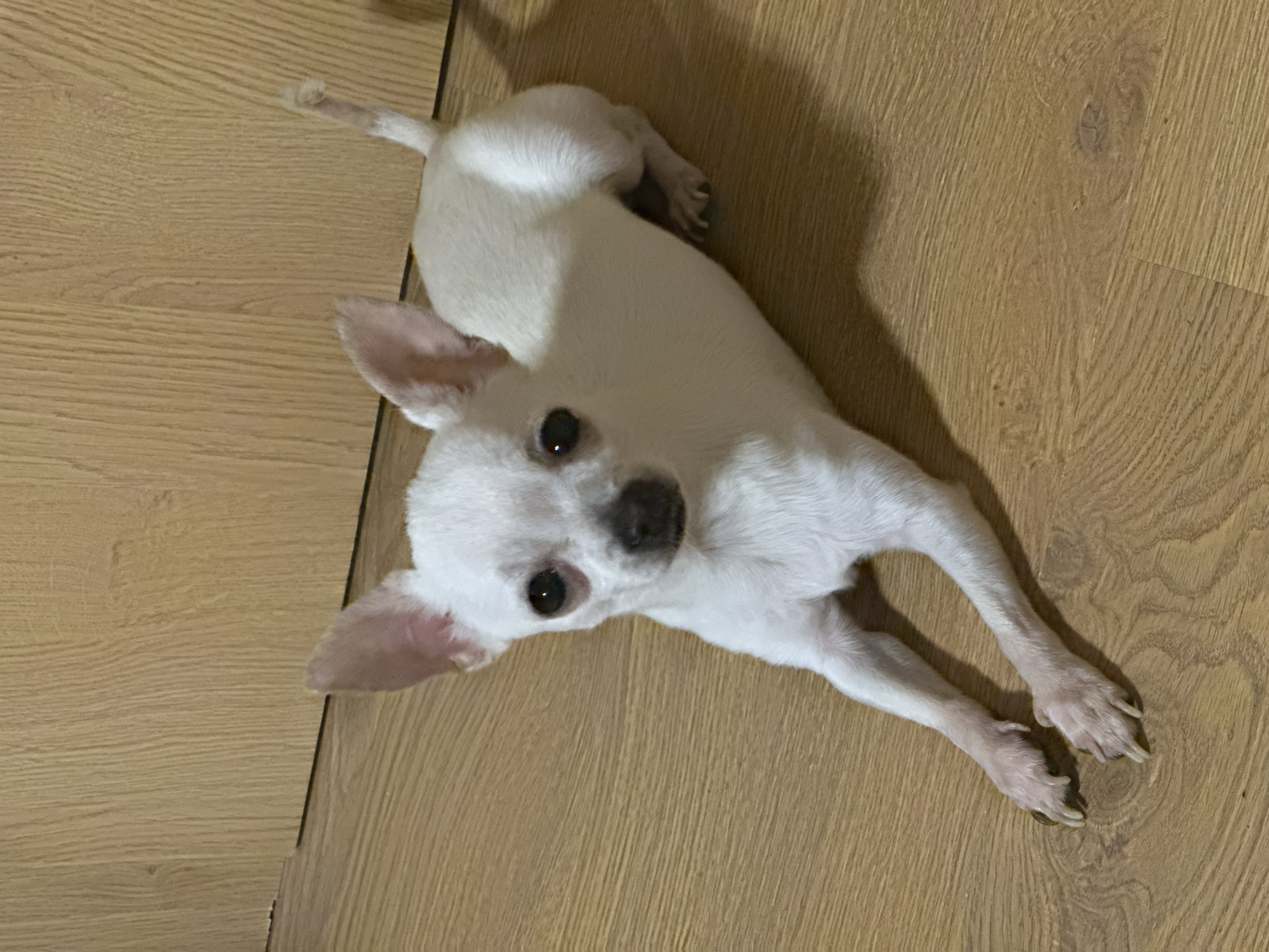 A white Chihuahua-type dog is lying on a wooden floor with its front paws extended
