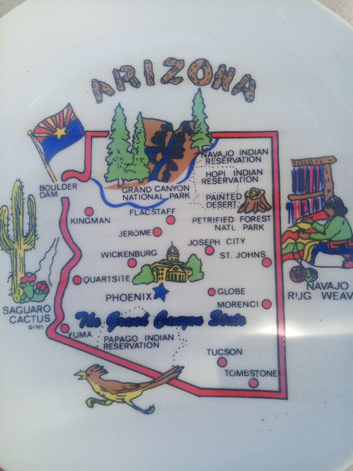 - "The image displays a white circular souvenir plate or similar decorative item, oriented vertically, featuring a colorful cartoon map of the state of Arizona, USA" by FM-pGTMm2, licensed under CC BY 4.0