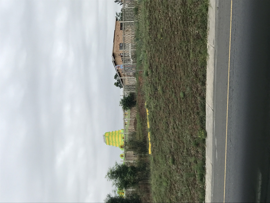 An outdoor scene shows a yellow tower-like structure with a Hindu temple design, partially obscured by trees, in front of a brick building with a fenced yard. A white fence runs along the property line. The sky is overcast. A grassy field sits beside a paved road with a yellow line marking the lane. The image is rotated to the left.