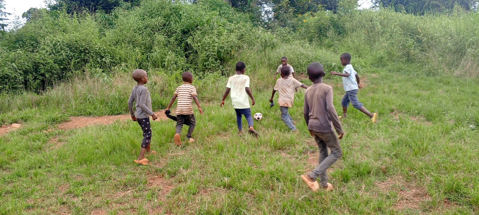 In a grassy field in Ngalula, Democratic Republic of the Congo, a group of seven young, barefoot boys are engaged in a soccer game