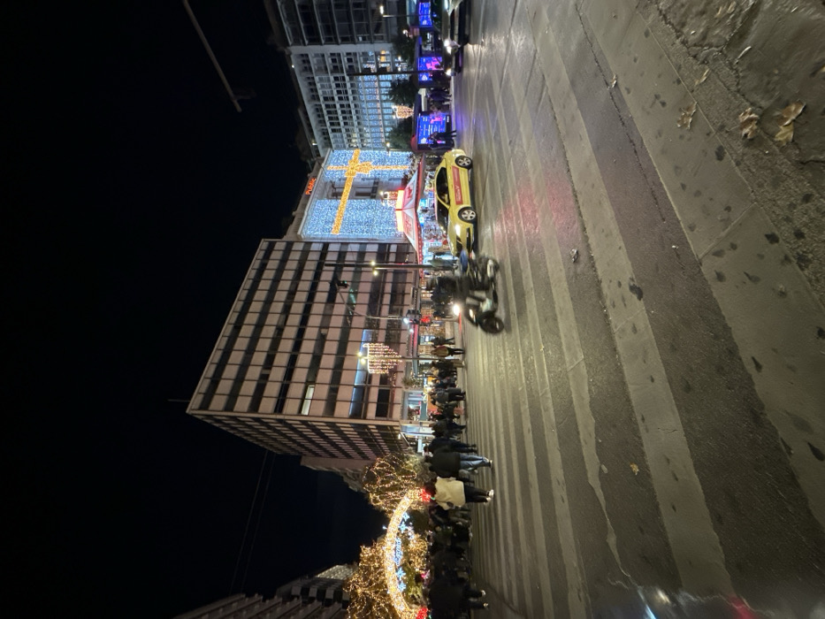 - "A nighttime cityscape shows buildings decorated with festive lights, with a tall structure adorned with a large gift-shaped light display" by FM-n6yWE2, licensed under CC BY 4.0