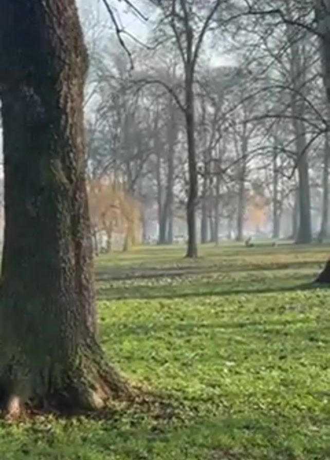 park with trees and green grass. The trees are mostly bare, with some leaves scattered on the ground. The lighting is bright and diffused, possibly due to fog or haze. There are other trees in the background, some possibly willow. There are no people visibly present, but there appear to be shapes possibly of people or other park-goers in the distance. The camera pans slowly from left to right.