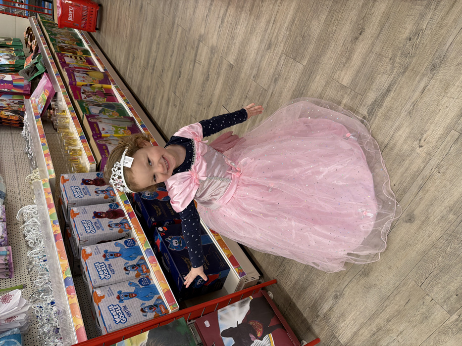 The image displays a young child, appearing to be a girl, standing in an aisle of a retail store in Perl, Germany. The child, with light brown curly hair, is wearing a pink princess costume, featuring a silver tiara with a price tag, a pink satin bodice over a dark blue long-sleeved shirt, and a long, sparkling pink tulle skirt. She smiles broadly while facing the camera, with her right arm slightly extended to her side. The background shows multiple retail shelving units stocked with various merchandise, including boxes labeled "Weezle Goozle Kostüm" and "DAS ALIEN." A red shopping cart with the "ROFU" logo is partially visible on the right side of the aisle. The floor consists of light-colored wood laminate panels.