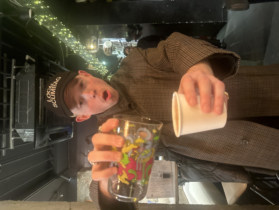 A man wearing a black cap labeled "LOCAL SCUMBAG" and a brown plaid coat poses while pouring the contents of a white paper cup into a glass