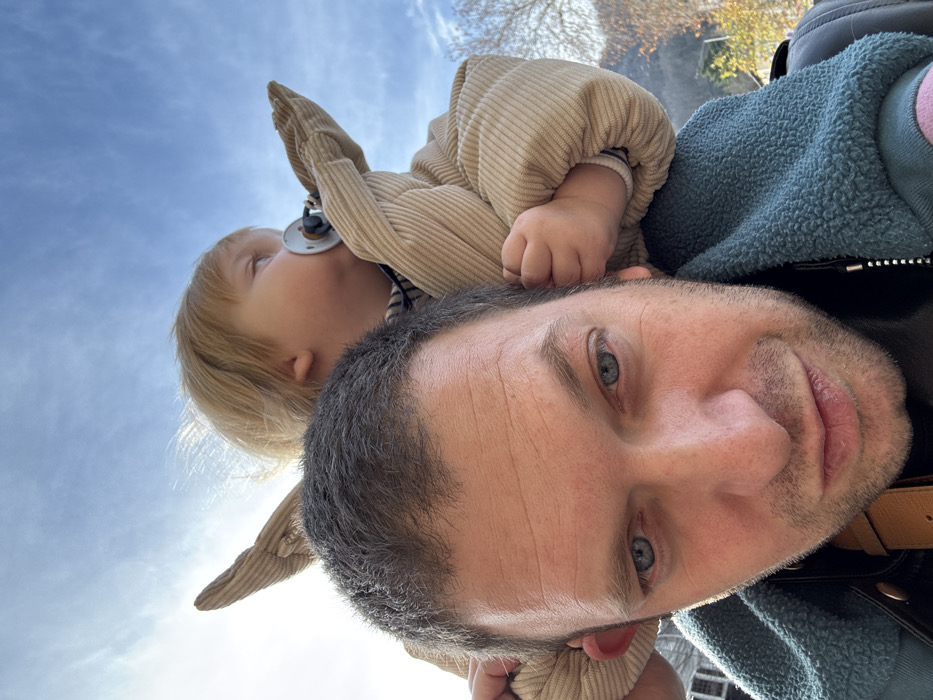 An adult male carries a child on his shoulders in an outdoor setting in the city of Como, Italy. The adult, positioned in the foreground, looks directly into the camera with a direct gaze, exhibiting short dark hair, light stubble, and blue eyes. He wears a teal fleece garment over a darker jacket, with a tan strap visible. The child, a blonde-haired toddler, sits on the adult's shoulders, facing right in profile, with a white and dark grey pacifier in their mouth. The child wears a beige corduroy jacket over a striped garment and has hands grasping the adult's head near the ears. The background features a clear blue sky with sparse white clouds, and a blurred hillside with deciduous trees displaying autumnal foliage (yellows and oranges) is visible to the right. Faint, out-of-focus structural elements are present on the distant left.