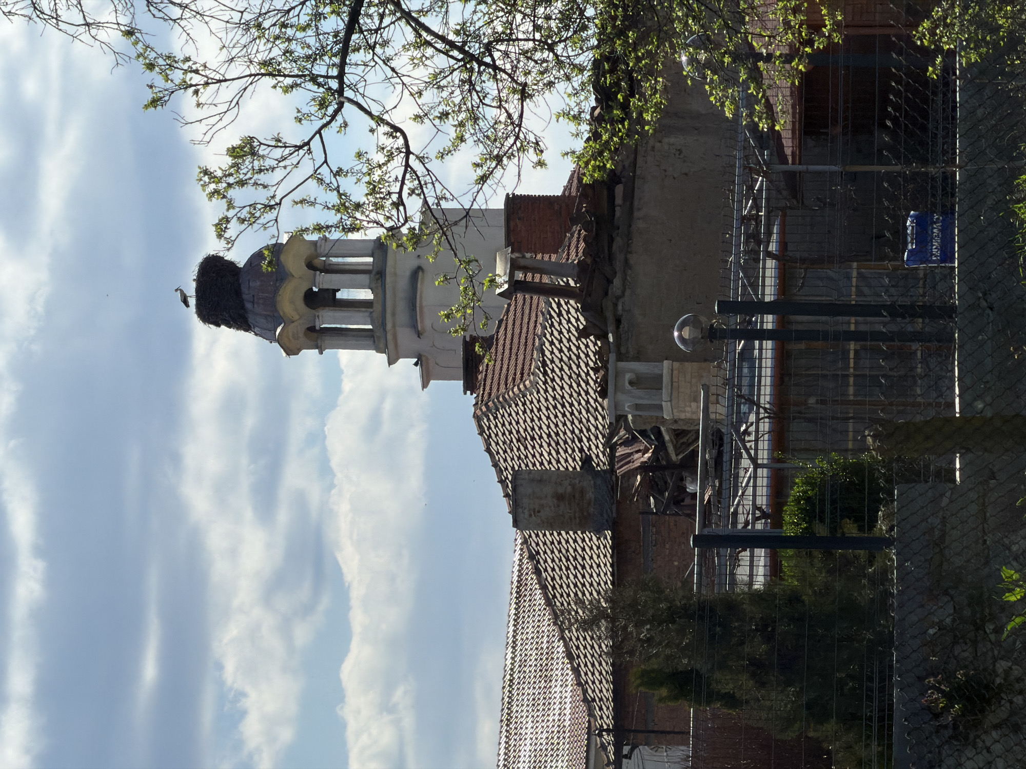 The image depicts a stork standing in its nest atop a tower in the city of Stamboliyski, Bulgaria. The tower is white with a dark dome-shaped roof supporting the large nest. The sky is visible in the background, with white clouds. In the foreground, part of a building with a red-tiled roof is visible. To the right, there is a fence and some vegetation. The image appears to be taken from a ground-level perspective.