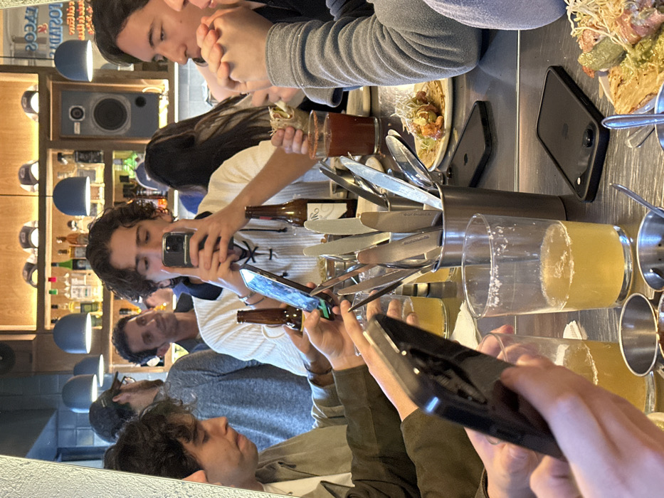 A group gathers around a table at a restaurant. Most are engaged with their phones, holding them up to seemingly take photos. A cylindrical container filled with knives sits centrally on the table. Drinks in tall glasses, beer bottles, and plates of food are also present. A speaker and bottles of alcohol are visible on a shelf in the background. The image suggests a social gathering where technology is prevalent.