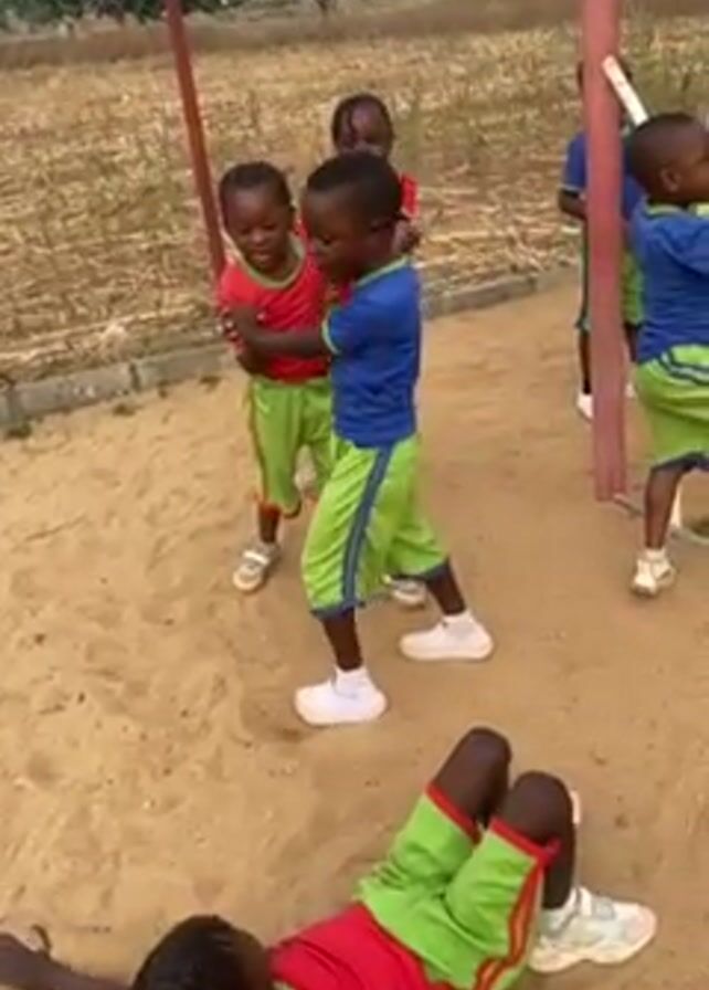 group of young children, possibly preschoolers, playing in a sandy area. Some are wearing matching red and green athletic outfits, while others wear blue and green. One child is lying on their back in the sand, while two other children are standing and appear to be playfully wrestling or pushing each other. Another child stands nearby watching. There is a metal structure with poles and rungs in the background, and a chain link fence. The setting appears to be an outdoor play area, possibly at a school or daycare. There is dry vegetation visible behind the fence.