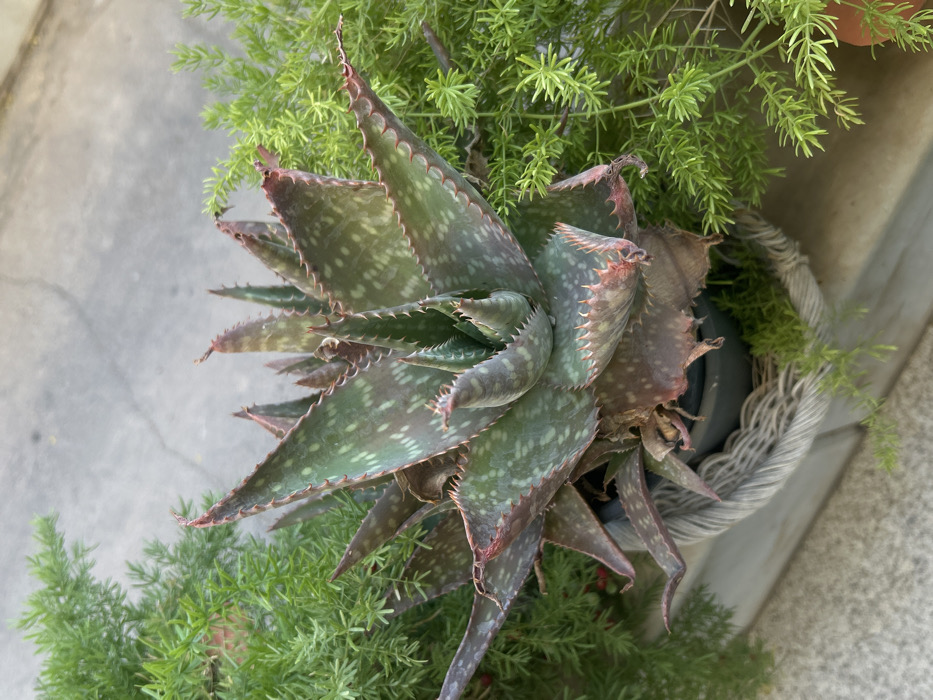 The image displays a close-up, overhead view of potted plants. A central succulent, consistent with an Aloe or Gasteraloe species, is the primary subject. This plant exhibits a rosette formation of thick, lanceolate leaves, which are dark green to bluish-green with scattered pale green or white spots. The leaf margins are serrated with distinct reddish-brown spines, and the tips and older leaves show a reddish-pink or reddish-brown coloration. This succulent is contained within a dark inner pot, which rests inside a decorative, light-gray, braided rope-like outer container. Flanking the central plant on both the left and right are masses of bright green, fine, feathery foliage, consistent with Asparagus fern, with small red berries visible within the fern on the left. The background consists of a light-gray concrete surface. No individuals or discernible actions are present. The scene is located in Kafr Sousa Municipality, Syria.