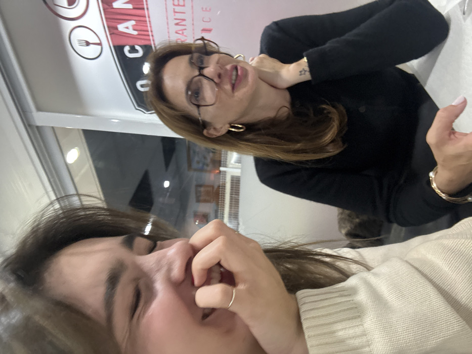 Two women are posing for a selfie in what appears to be a restaurant. One woman is wearing glasses, a black sweater, and gold hoop earrings, and she has a star tattoo on her wrist. The other woman is in the foreground, wearing a white sweater and a simple ring. The restaurant sign is visible behind the woman in the background.