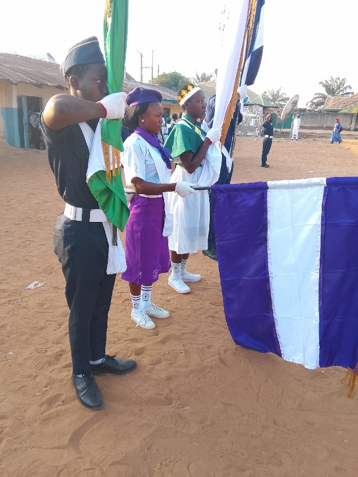 The scene depicts an outdoor ceremonial gathering on reddish-brown dirt ground in Akwanga, Nigeria, under daylight conditions. Three young individuals stand in the foreground, arranged from left to right, holding flags. The leftmost individual is a male wearing a dark uniform consisting of a black short-sleeved shirt, black trousers, a white belt, black dress shoes, and a black peaked cap. He wears white gloves and holds a vertical green, white, and green striped flag (consistent with the Nigerian flag), with visible gold fringe on the flag's lower edge. He is looking to his right. The middle individual is a female, also wearing white gloves. She has on a white short-sleeved top, a purple beret, a white sash across her chest, and a purple skirt that extends below her knees. She wears white socks with red striped accents and white sneakers. She holds a flag pole or staff, positioned in front of a larger, horizontally draped flag. She is looking forward/right. The rightmost foreground individual is a female, wearing a white dress or robe, a green cape-like garment, a gold crown-like headpiece, and white gloves. She holds a flag pole or staff and looks forward/right. In the immediate foreground, a large flag with vertical purple, white, and purple stripes is displayed, its bottom edge showing gold fringe. This flag appears to be held or supported by the middle and possibly the rightmost individuals. Behind the rightmost individual, another flag, predominantly white with black and gold elements, is partially visible. The background features several elements: a low, single-story building with a blue lower wall and a corrugated metal roof on the left; similar residential structures on the right; utility poles and lines; and scattered vegetation. In the mid-ground to the right, a man in a dark uniform is visible, saluting. Further in the background, other individuals are present, some wearing white robes, and a satellite dish is discernible on the right side. The overall environment appears dry and dusty.