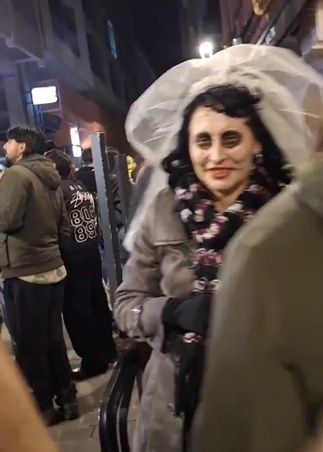 person dressed as a zombie bride walking down a crowded street at night. The person is wearing a gray coat, a floral scarf, black gloves, and a white veil. They have dark makeup around their eyes and a red smile. Other people are walking around them, and some are sitting at tables outside of businesses. The buildings lining the street are lit up.