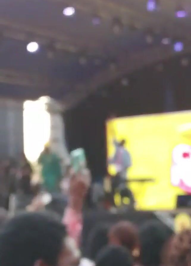 live performance at an outdoor event. The camera is positioned amongst the audience, looking up at a stage setup with a metal truss structure holding lights. The lights are a mix of white, red, and blue. Two performers are on stage: one in green work clothes with a yellow hat, and another in a light-colored shirt and jean jacket. A band is visible behind them. A large yellow screen displays an animated graphic, seemingly a logo for the event. Many audience members are visible, some holding up their phones to record. Some are raising their hands in the air, seemingly enjoying the show.