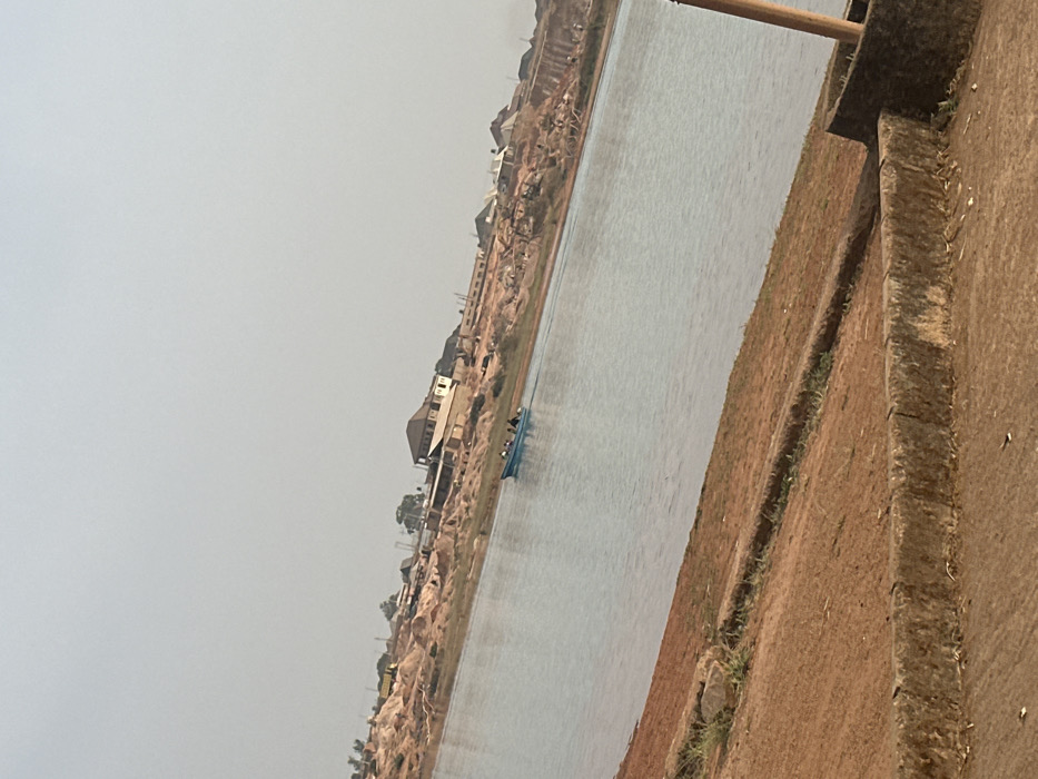 A body of water extends from the foreground to the distant horizon, bordered by buildings on one side and a brown, layered structure on the other