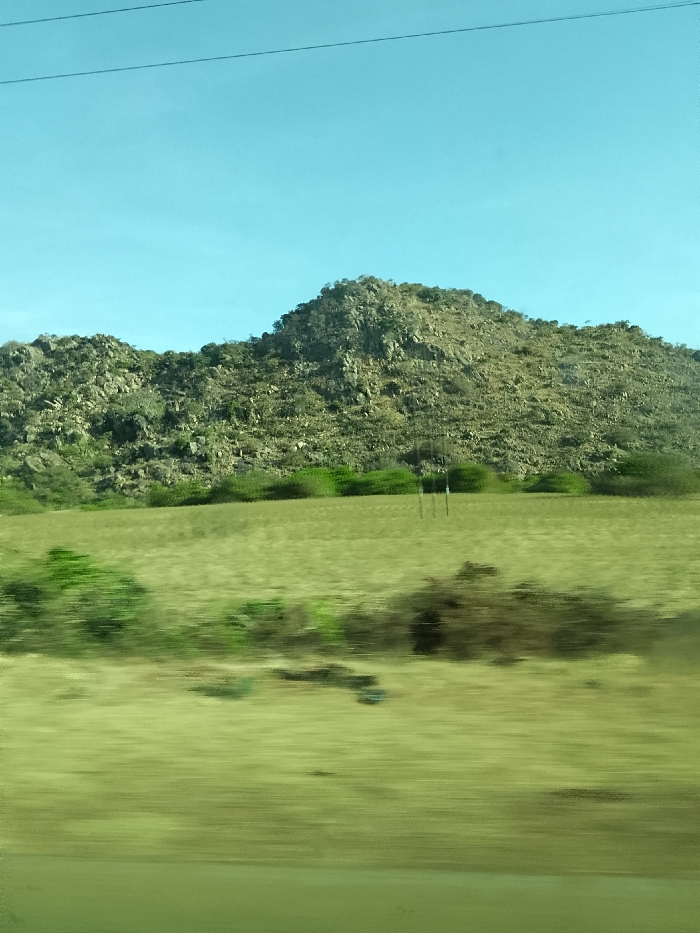 A rocky, barren hill rises from a field of dry grass. Scattered green bushes dot the base of the hill and the field below. Utility poles stand in the middle ground. The sky is a clear, bright blue. Motion blur suggests the photo was taken from a moving vehicle. Electrical wires stretch across the top of the frame.