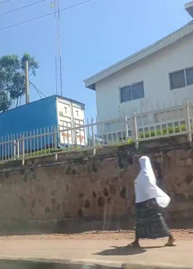 The video captures a streetside view from a moving vehicle. The camera sweeps past a series of buildings and structures. First, a white building with the word "Kami" visible on the roof, then a blue shipping container behind a white fence. Next, the camera passes a building with a "Dulux colour centre" sign. Finally, the camera passes parked cars and more buildings. The sky is blue. The perspective suggests the video was recorded from inside a moving car.