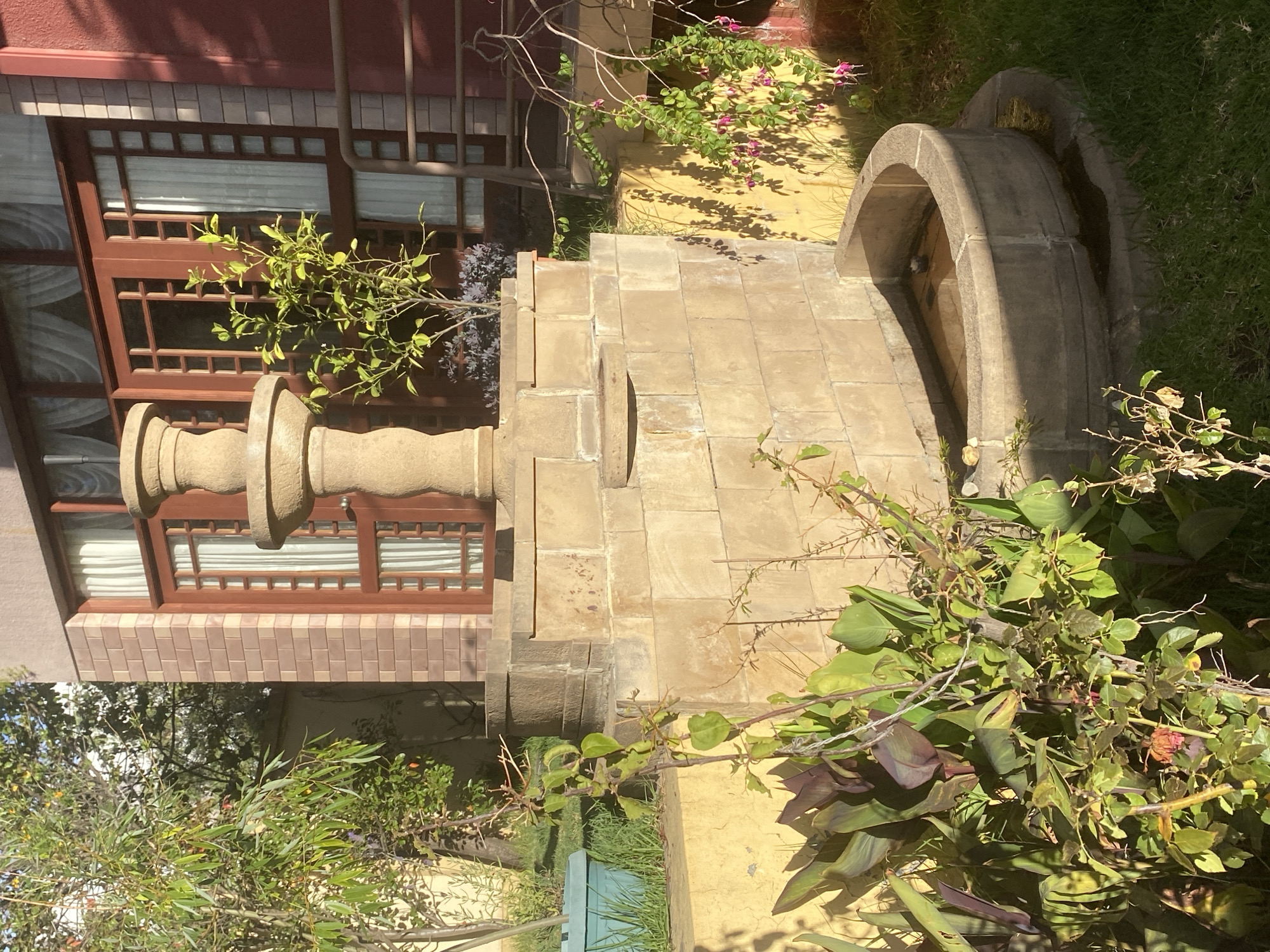 A slightly canted outdoor shot shows a stone fountain feature in front of a building in an unknown location in La Paz, Bolivia. The fountain's base is made of light-colored stone tiles, stacked to form a wide, square platform. Atop this platform sits a circular stone basin, partially filled with water, and a tiered stone pillar to the left. The building behind the fountain has brown-framed windows with white shades, and a strip of decorative tilework lines the bottom. The surrounding environment consists of grass and various plants.