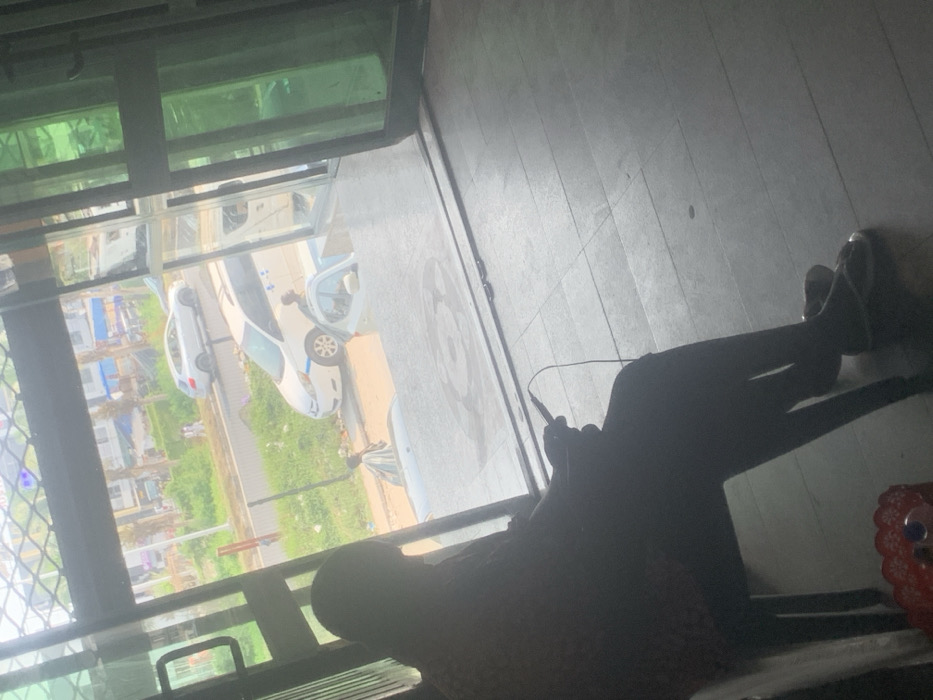 The image captures an interior view looking out onto a street in Jakande, Nigeria. In the immediate foreground, a person is seated on a chair, facing away from the camera and towards the exterior. This individual is largely silhouetted, wearing what appears to be a patterned top and dark trousers, with white flip-flops on their feet. They are holding a dark-colored mobile device with a black wired earphone cable extending from it. The floor beneath them consists of light-colored, square tiles. A small, partially visible red object with white details rests on the floor to the left. The view outside is framed by a dark doorway or window structure, featuring green-tinted glass panels on the right and a metal grid pattern at the top. Beyond this opening, a street scene unfolds under bright daylight. A paved road runs horizontally across the midground. Several vehicles are present: a white SUV is visible further down the road, and a white minivan with blue markings is parked closer to the foreground on the roadside. The reflection of another white car is visible on the ground surface near the minivan. People are also discernible in the background: one individual with a patterned item draped over their shoulder is walking near the parked minivan, and two more distant figures are seen walking on a path or sidewalk adjacent to the road. Green foliage and bushes line the roadside, separating it from distant buildings under a clear sky. A red pole stands vertically on the roadside to the left.
