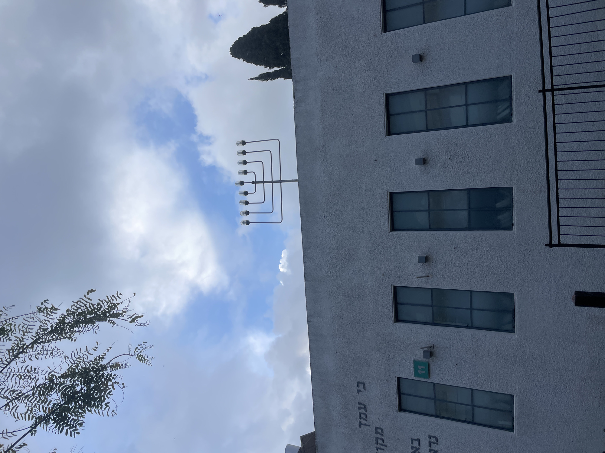 An exterior, low-angle photograph captures the facade of a building in Petah Tikva, Israel, under a partly cloudy sky. The building exhibits a textured, light-colored (off-white or light gray) stucco finish. Positioned on the rooftop, a large, dark-colored metal Hanukkah menorah with nine light bulb sockets is prominently displayed. To the right of the menorah, the upper sections of several dark green, conical coniferous trees, consistent with cypress, extend above the roofline. The building's upper facade features several tall, narrow, rectangular windows with dark frames and translucent panes. A small, light blue-green rectangular sign, bearing the white numeral "11," is affixed to the wall above and between the two leftmost visible windows. Multiple small, square-shaped wall-mounted light fixtures are distributed between the windows. Partial Hebrew text, consisting of the words "כי עמד", "מקו", "בא", and "נר" (from top to bottom, partially obscured on the left), is stenciled in dark gray on the upper left section of the facade. In the lower foreground, a black metal fence with vertical bars and a horizontal top rail spans the width of the frame. A dark vertical post is visible on the lower-left. A branch with small, dark green leaves extends into the upper left quadrant of the frame, partially obscuring the light blue sky which is interspersed with white and gray clouds. No individuals or discernible actions are depicted.